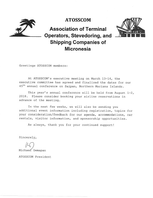 “The Kanoa Resort, our venue for the 45th Annual Meeting of ATOSSCOM, has offered a discounted rate for rooms. The rate is $120 + 15% tax and includes a free upgrade to the Tower Deluxe. For this special offer, you may contact Kanoa Resort directly at the following telephone numbers: 670-2378727 (Ivan) or 670-237-8728 (Lua) or via email at: [email protected].”